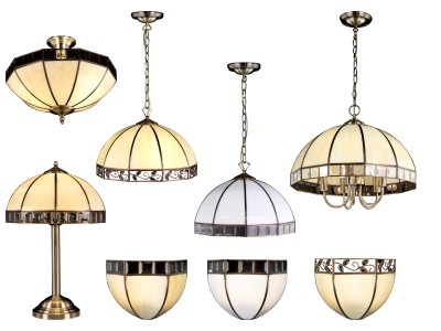 Каркас изделий металлический, популярного оттенка бронзы, плафоны из витражного стекла изготавливаются вручную. Основная часть моделей создана с использованием бежевого стекла, однако, подвесная люстра и бра на стену представлена с белым матовым стеклом. Плафоны и абажуры по краю украшены рядом прозрачных стеклянных элементов, но есть вариант с ажурным латунным орнаментом.