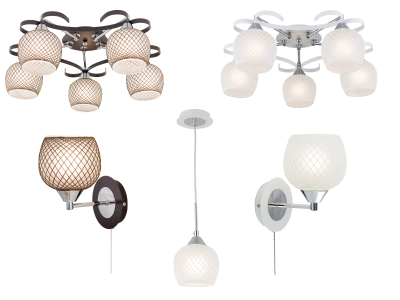 Каркас — из металла, основной оттенок (белый или кофейный) дополняют декоративные хромированные детали. Плафоны оригинальной формы изготовлены из матового стекла белого цвета. Один из подвесных светильников дополнительно украшен тканевой сеткой кофейного цвета, придавая ему особое очарование.