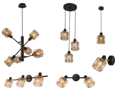 Корпус и основание изделий выполнено из металла черного цвета; Плафоны стеклянные, прозрачные с легкой светло-янтарной тонировкой. Форма плафонов на выбор: цилиндрический плафон обрамлен цилиндрическим золотистым каркасом, плафон в форме усеченного конуса обрамляет каркас в форме многогранника оттенка шампань.
