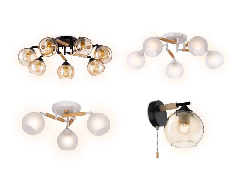 Два модных цветовых сочетания: белый корпус с матово-белыми плафонами, черный корпус — с прозрачными плафонами с легкой тонировкой оттенка шампани. Светильники дополняют декоративные элементы из светлого дерева.