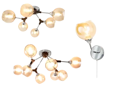 Каркас изделий металлический, сочетающий в себе хромированные детали и элементы кофейного оттенка. Плафоны в форме усеченной сферы, из прозрачного стекла стильного медового цвета.