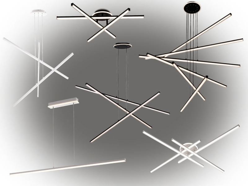 Вместо традиционных плафонов используются световые модули в форме штанг. Их продуманные комбинации формируют впечатляющие световые композиции, создавая неповторимую геометрию освещения. Ассортимент серии охватывает широкий спектр решений — от потолочных и подвесных люстр до горизонтальных подвесов и настенных бра.