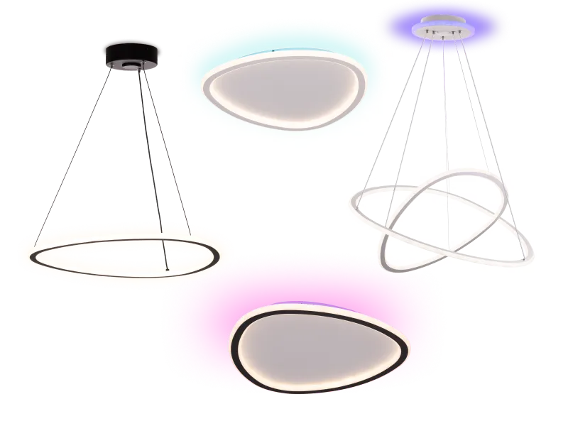 - Во всех потолочных моделях включать и настраивать независимую RGB-подсветку основания;