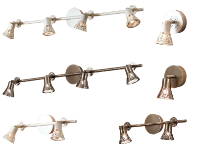 Корпус металлический, в двух цветовых решениях: бронзовое с покрытием гальваникой или молочно-белое с золотистой патиной. Литые плафоны имеют декоративный ажурный рисунок, они закреплены на шарнирах, позволяющих менять направление света, создавая уникальные светодизайнерские решения. Каждый плафон вращается независимо от других.