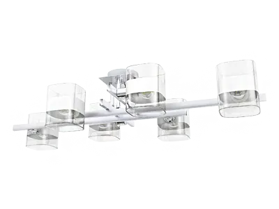 Плафоны стеклянные, в сечении имеют форму квадрата с закругленными углами. Прозрачное стекло украшено элегантной полосой белого цвета. Для плафонов нужно использовать лампочки с цоколем Е14, колбу выбирать в форме шарика («свеча» не подойдет).