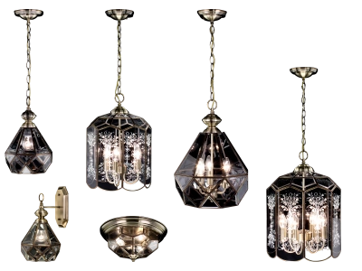 Открывает модельный ряд потолочная люстра с закрытым витражным плафоном; кроме того, есть подвесные светильники на одну и три лампы с плафоном в форме ограненного кристалла, и подвесные модели с плафоном в форме бутона колокольчика, на одну, три или шесть ламп. Завершает коллекцию бра с кристальным плафоном.